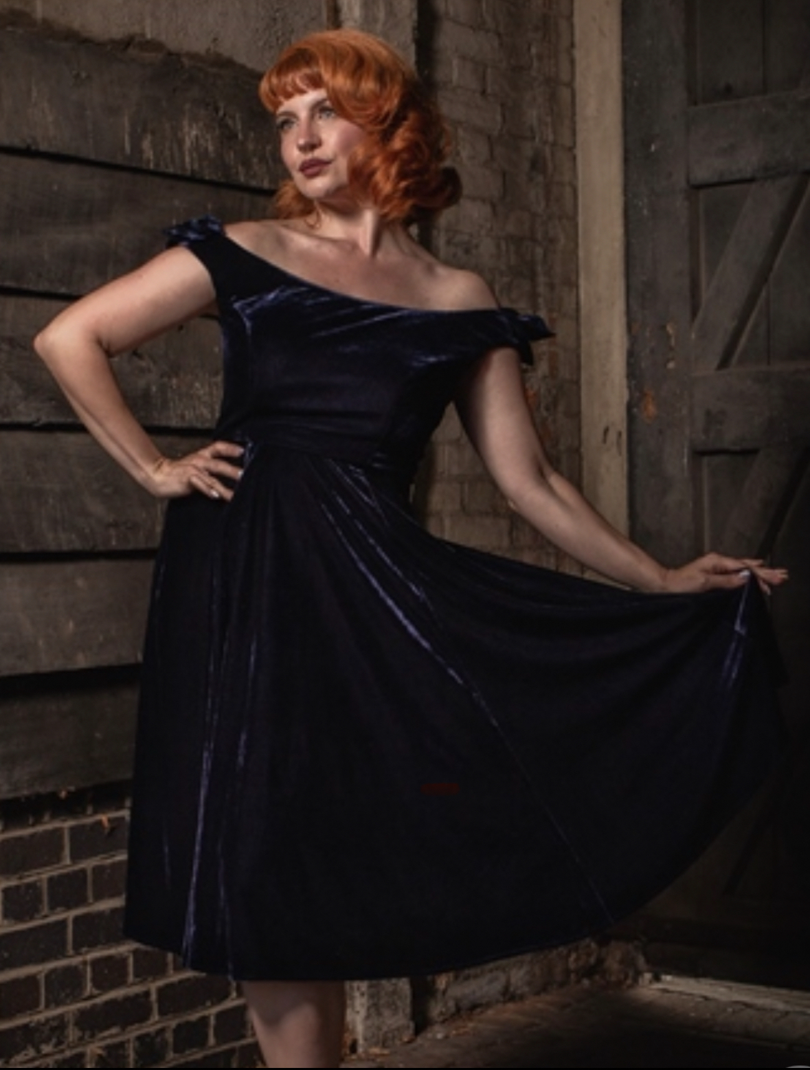 The Suanna Swing Dress is made from luxurious velvet in navy blue and has glamorous swing skirt with a boat neckline, bardot sleeves with sweet little bows on shoulders. It fastens at the centre back via a covered zip. This dress can be worn with or without a petticoat